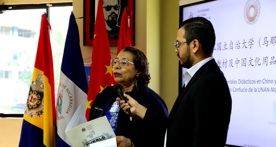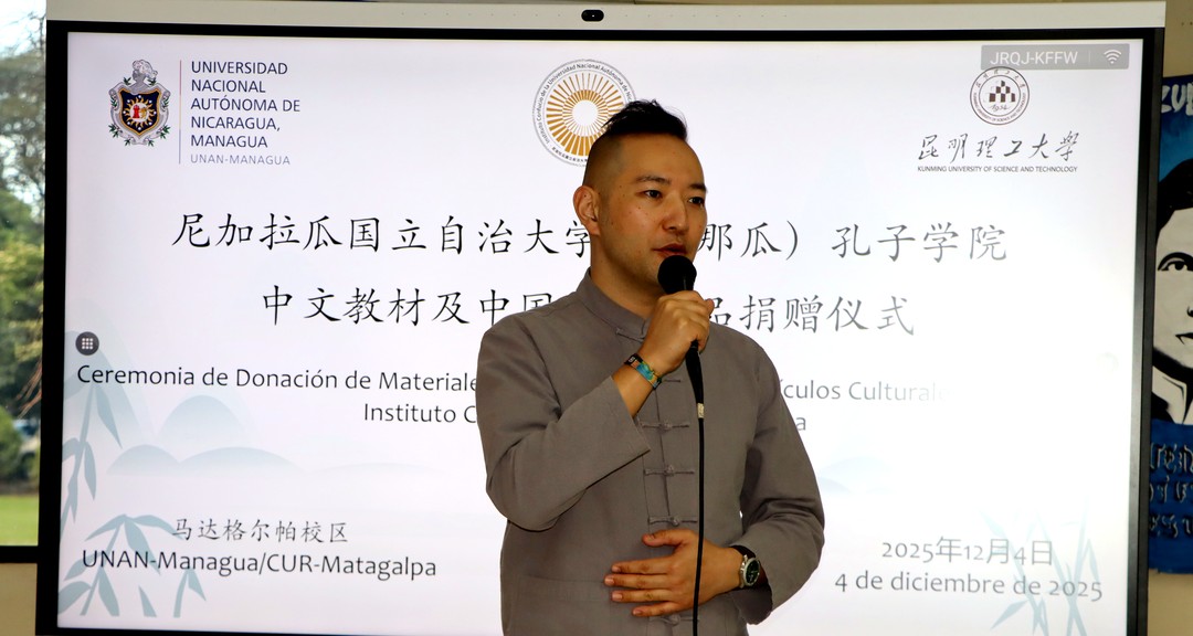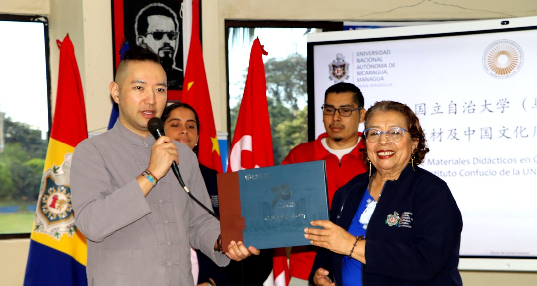 El Sr. Vicente Chen Zhan, director chino del Instituto Confucio, entregó 302 libros sobre cultura china, con contenido de historia, costumbres, entre otras temáticas, y 147 artículos de la cultura china, entre ellos juegos didácticos, juegos tradicionales y máscaras. Asimismo, hizo referencia sobre el «Plan de Capacitación Doble Cien», un proyecto que por primera vez se implementará en Nicaragua y beneficiará a 100 estudiantes de la carrera de Agronomía.