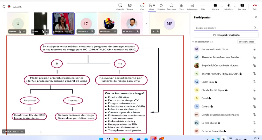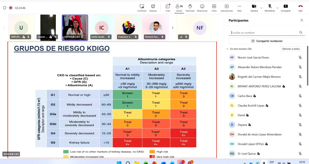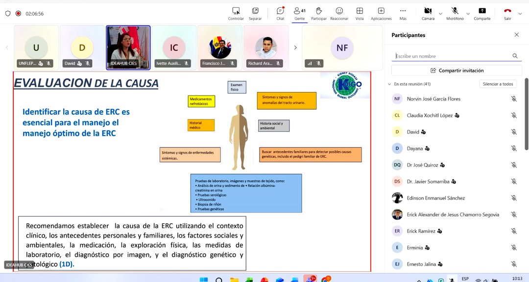 El webinario permitió reflexionar sobre los principales factores de riesgo asociados a esta enfermedad, entre ellos la hipertensión, la diabetes y las enfermedades cardiovasculares. Estas condiciones representan una de las principales causas de deterioro de la función renal, lo que hace indispensable promover estrategias preventivas desde los servicios de salud.