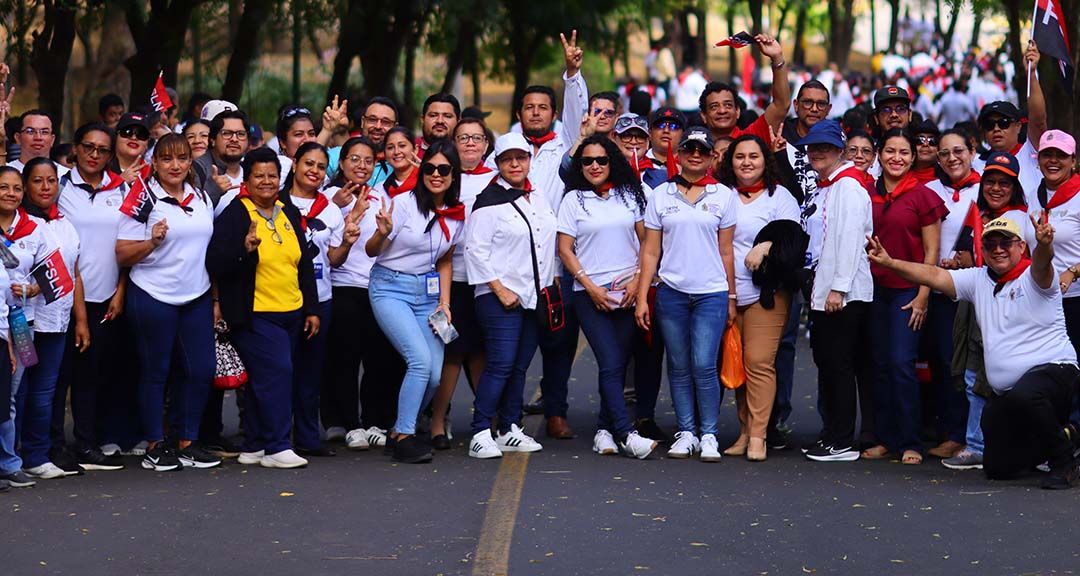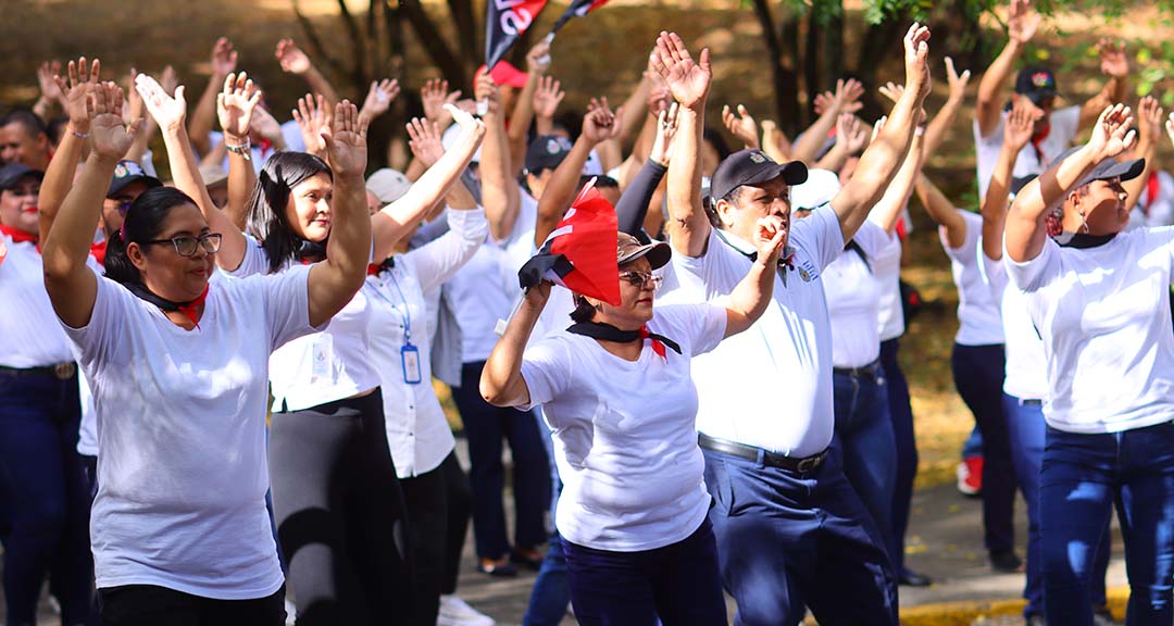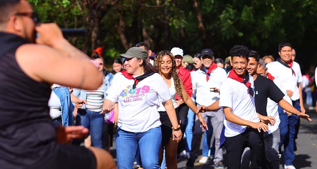 Con alegría y espíritu revolucionario, militantes sandinistas de la Universidad del Pueblo Presidente, UNAN-Managua, se sumaron a la caminata y bailatón, realizados en el Recinto Universitario Rubén Darío, en el marco del 92. ° aniversario del paso a la inmortalidad de nuestro Héroe de Mil Batallas y Mil Victorias, Augusto C. Sandino.