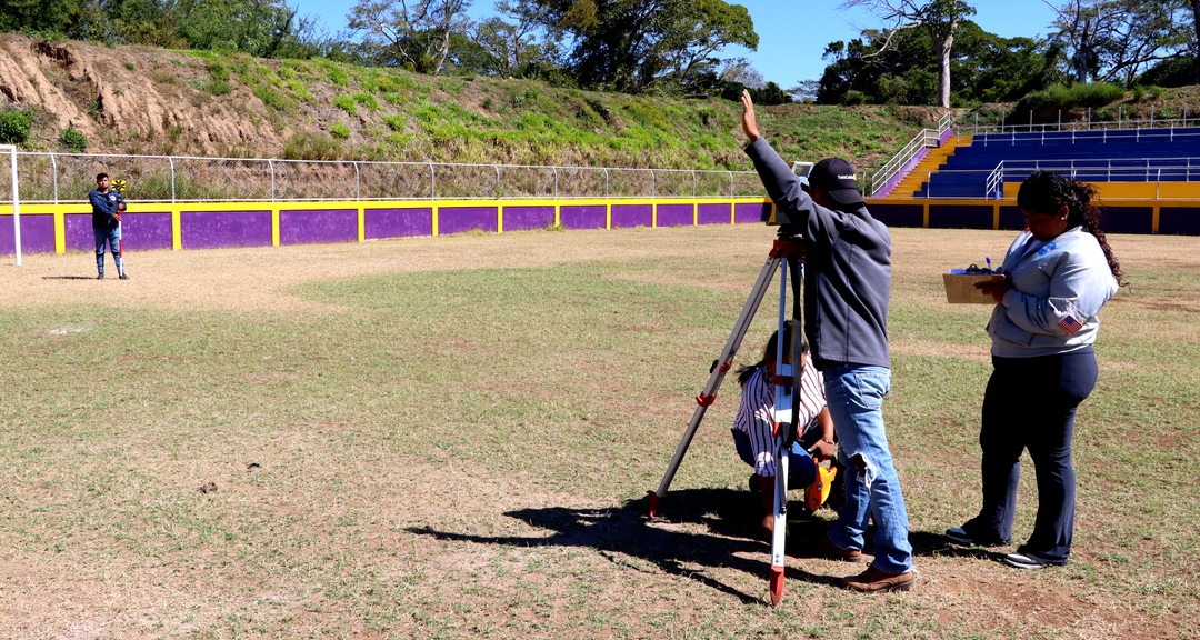 En este contexto, como parte del desarrollo del Programa Universidad en el Campo – UNAN-Managua, en la sede El Zapotal, comunidad de Jinotepe, estudiantes de la carrera realizaron prácticas de campo correspondientes al Producto Integrador IV, contribuyendo de manera directa a la comunidad mediante la ejecución de mediciones perimetrales del campo de fútbol del municipio.